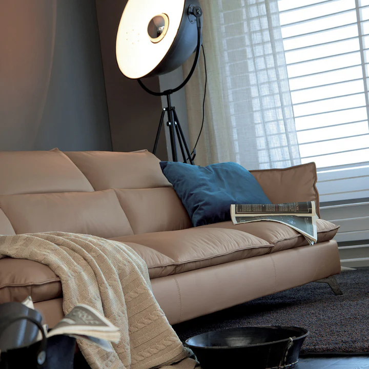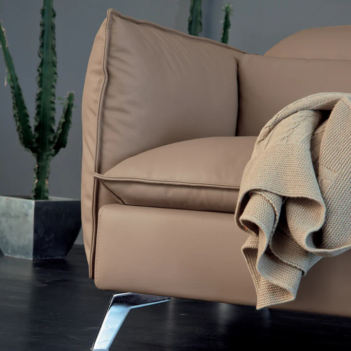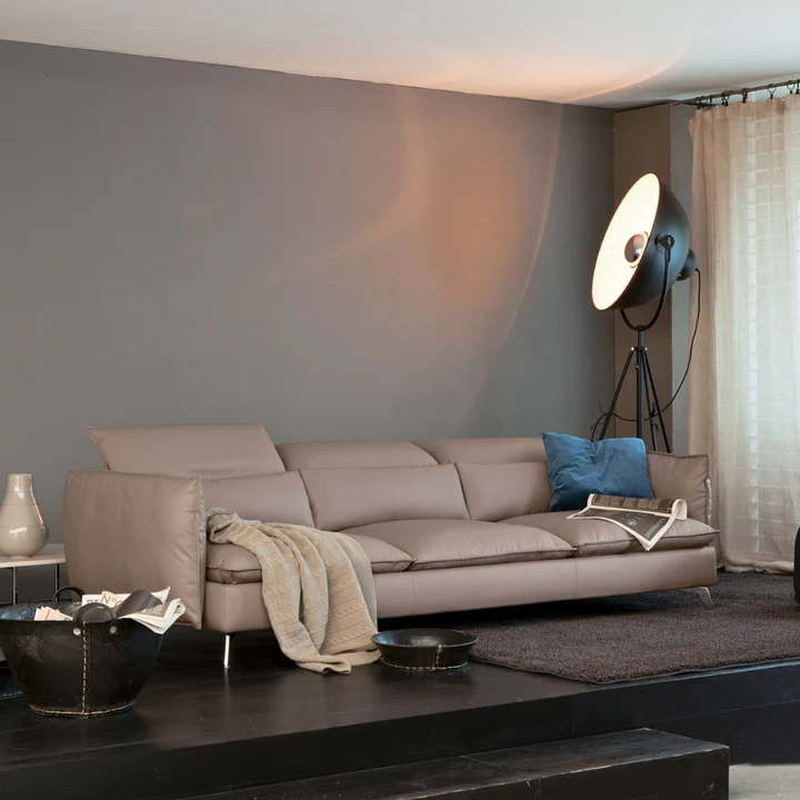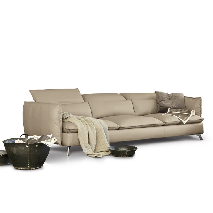 Leviet is the perfect synthesis between essential lines and enveloping comfort provided by the seats and backrests padded with soft feathers mixed with cotton flock. The thin armrests and raised feet give momentum to this timeless sofa. The manually reclining headrests in different inclination positions add further comfort to the seat.